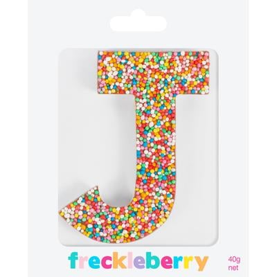 Belgian milk chocolate letter J covered with a rainbow of coloured sprinkles. Milk chocolate. Approx size: 10cm x 6cm. Weight 40g.