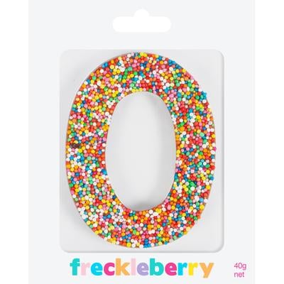 Belgian milk chocolate letter O covered with a rainbow of coloured sprinkles. Milk chocolate. Approx size: 10cm x 6cm. Weight 40g.
